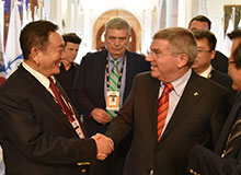 中国自行车运动协会主席崔大林向国际奥委会主席巴赫介绍 IM电竞瑞豹自行车